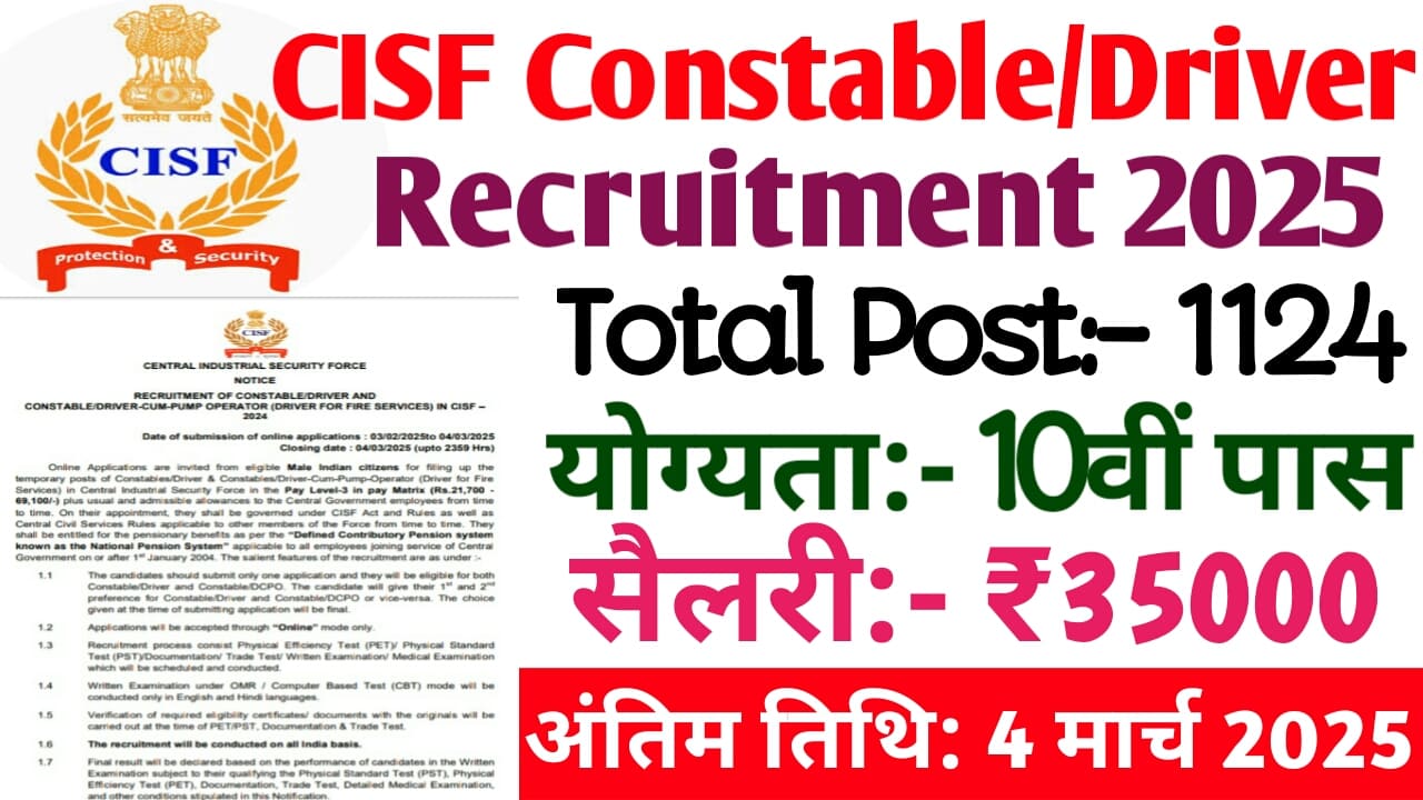 CISF Constable/Driver 1124 Recruitment: केंद्रीय औद्योगिक सुरक्षा बल (CISF) द्वारा कांस्टेबल ड्राइवर के पदों पर भर्ती का नोटिफिकेशन जारी किया है सीआईएसफ द्वारा कांस्टेबल ड्राइवर के 1124 पदों पर नोटिफिकेशन जारी किया गया है इस भर्ती के लिए महिला व पुरुष अभ्यर्थी दोनों आवेदन कर सकते हैं जिसमें आवेदन फॉर्म भरने की अंतिम तिथि 4 मार्च 2025 रखी गई है।