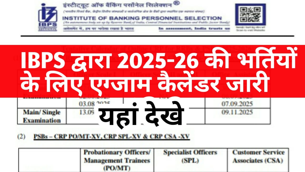 IBPS Calendar 2025 : आईबीपीएस द्वारा 2025-26 मे आयोजित होने वाली सभी भर्तियों का एग्जाम कैलेंडर जारी कर दिया गया है जिसमें क्षेत्रीय ग्रामीण बैंकों और सार्वजनिक क्षेत्र के बैंकों में होने वाली भर्तियों के लिए एग्जाम कैलेंडर जारी किया है जिसमें विभिन्र्तियों की जानकारी दी गई है।